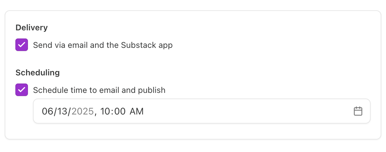 While in Draft of your Story → Continue Button (top right) → Scroll to bottom → Delivery & Scheduling Boxes checked → Click Calendar Icon (far right) → Change Date & Time to 6/13/2025 & 10am EST (or whatever your time should be to align with 10am EST)