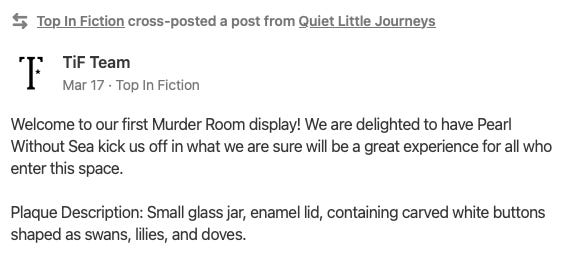 Do you have a question you’d like to ask the readers/writers in our little fiction community? Let me know in the comments and I just might select it for a future weekly issue!